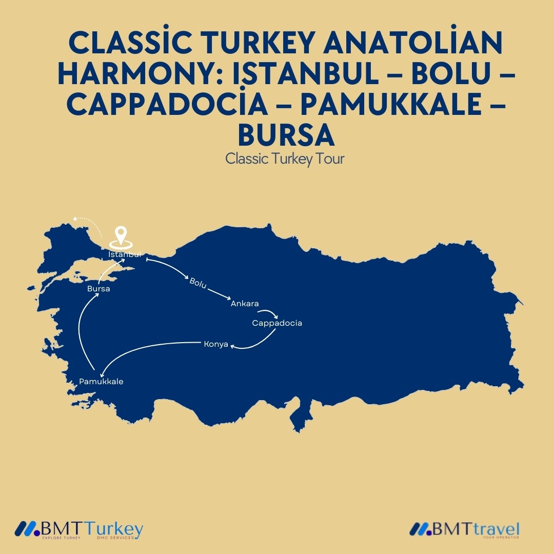 This 8-day journey blends Türkiye’s imperial heritage with its natural wonders. From Istanbul’s domes to Bolu’s forests, Ankara’s mausoleum, Cappadocia’s fairy chimneys, Konya’s spiritual heart, Pamukkale’s travertines, and Bursa’s Ottoman legacy—this tour is a perfect harmony of culture, nature, and faith.