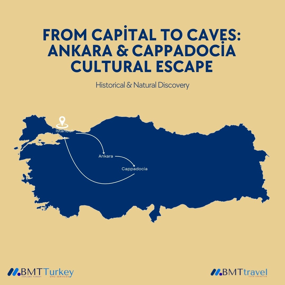 This 4-day journey connects the political heart of Turkey with its geological wonderland. From the museums and mausoleums of Ankara to the fairy chimneys and cave churches of Cappadocia, this tour offers a compact yet immersive experience of Anatolia’s heritage, spirituality, and artistry.